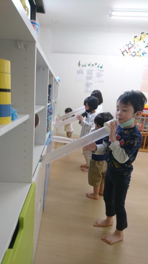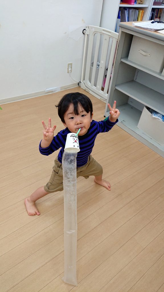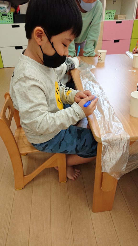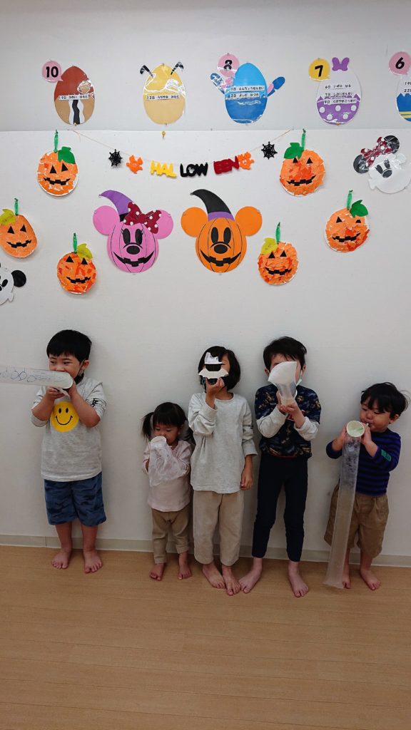 10月21日(水)は、ハロウィン製作第2弾!!をしまた。紙コップと細長いビニール袋を使っておばけの玩具を作りましたよ♡棚の穴の中に入れて「ふーふー」と膨らませてみたり、逆さにしてサックスみたいにして楽しんだり・・・こどもたちの発想はすごいですね♡